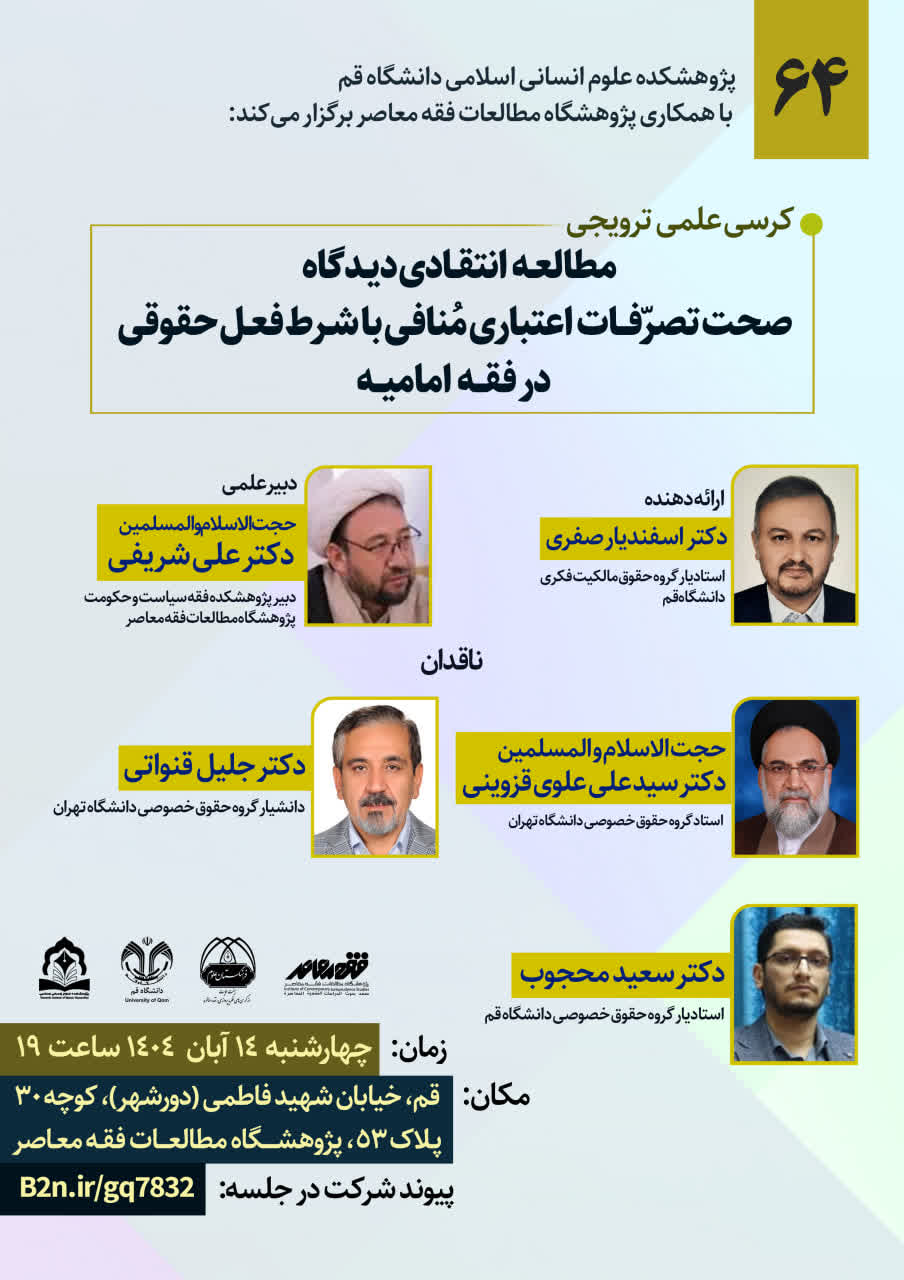 در شصت و چهارمین کرسی علمی ترویجی پژوهشکده، مطالعه انتقادی دیدگاه «صحت تصرّفات اعتباری مُنافی با شرط فعل حقوقی» در فقه امامیه بررسی میشود.