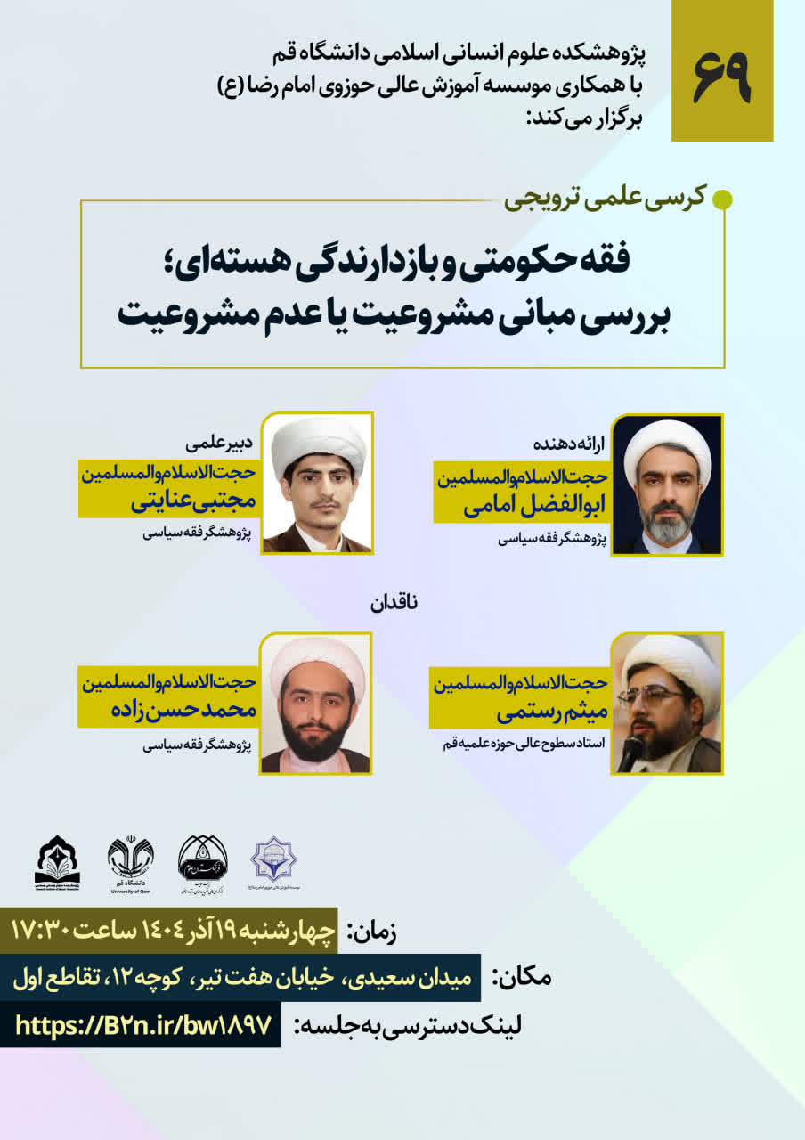 پژوهشکده علوم انسانی اسلامی دانشگاه قم با همکاری موسسه آموزش عالی حوزوی امام رضا (علیه السلام)، کرسی علمی ترویجی فقه حکومتی و بازدارندگی هستهای را برگزار می کند.
