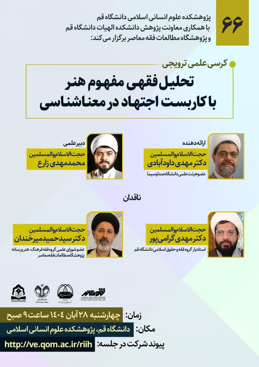 پژوهشکده علوم انسانی اسلامی دانشگاه قم با همکاری معاونت پژوهش دانشکده الهیات دانشگاه قم و پژوهشگاه مطالعات فقه معاصر، کرسی علمی ترویجی تحلیل فقهی مفهوم هنر با کاربست اجتهاد در معناشناسی را برگزار میکند.
